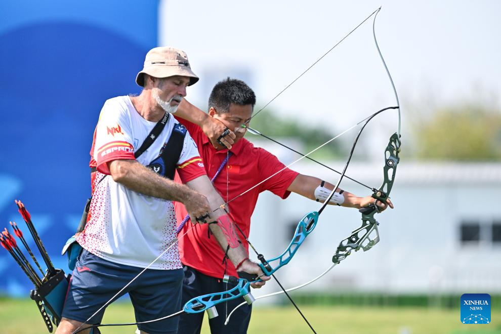 Wang Lei (L) of China and Cesar Vera of Spain are seen after the Archery Men's Barebow Elimination Group B Match at The World Games 2025 in Chengdu, southwest China's Sichuan Province, Aug. 15, 2025. (Xinhua/Yang Wenbin)