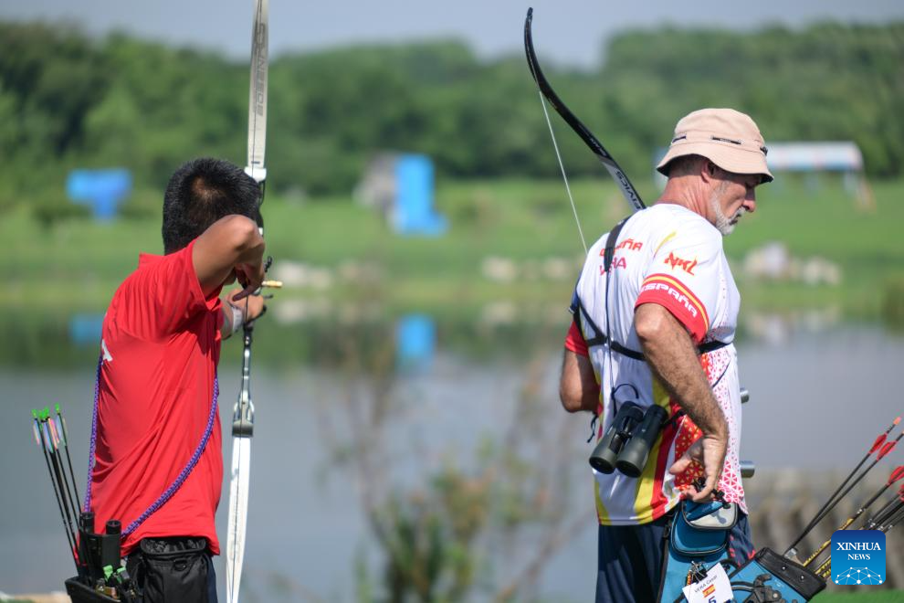 Wang Lei (R) of China and Cesar Vera of Spain compete during the Archery Men's Barebow Elimination Group B Match at The World Games 2025 in Chengdu, southwest China's Sichuan Province, Aug. 15, 2025. (Xinhua/Yang Wenbin)