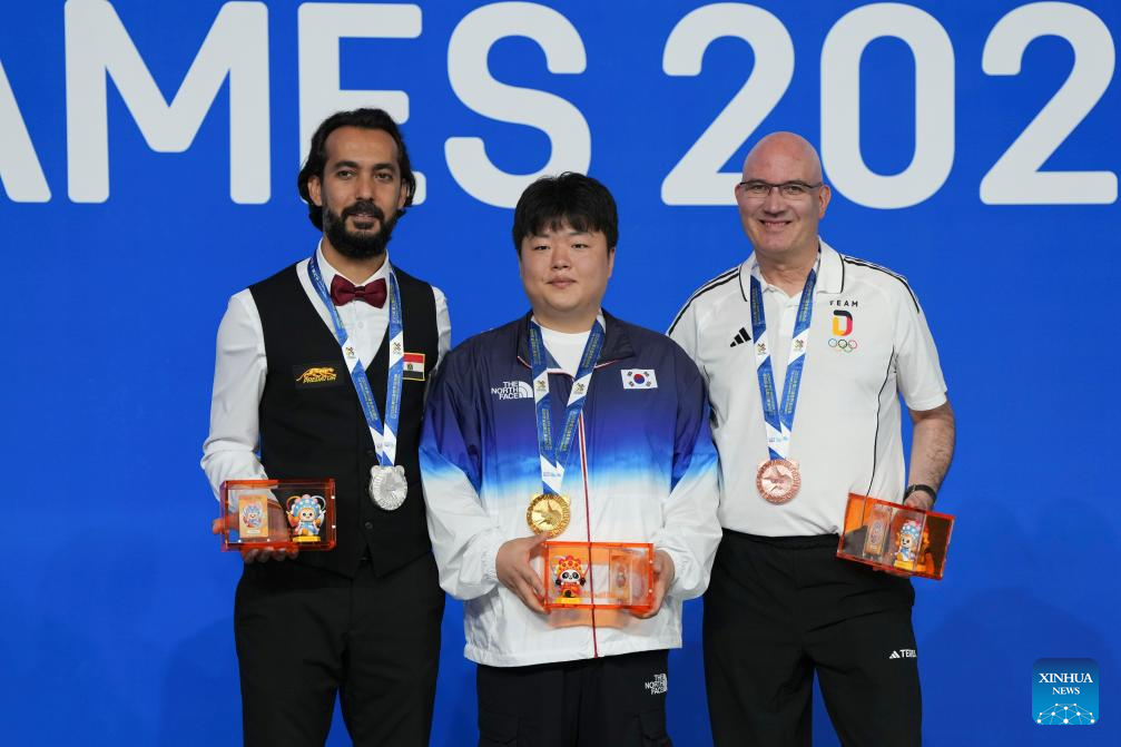 Gold medalist Cho Myungwoo (C) of South Korea, silver medalist Sameh Sidhom (L) of Egypt and bronze medalist Martin Horn of Germany pose during the awarding ceremony for Men's Carom Three Cushion of Billiards event at The World Games 2025 in Chengdu, southwest China's Sichuan Province, Aug. 14, 2025. (Xinhua/Xu Bingjie)
