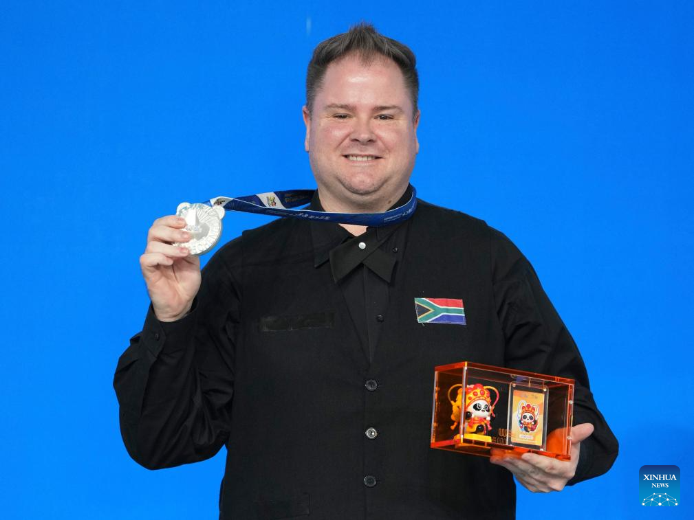 Silver medalist Jason Theron of South Africa poses during the awarding ceremony for Mixed Heyball Pool of Billiards event at The World Games 2025 in Chengdu, southwest China's Sichuan Province, Aug. 14, 2025. (Xinhua/Xu Bingjie)