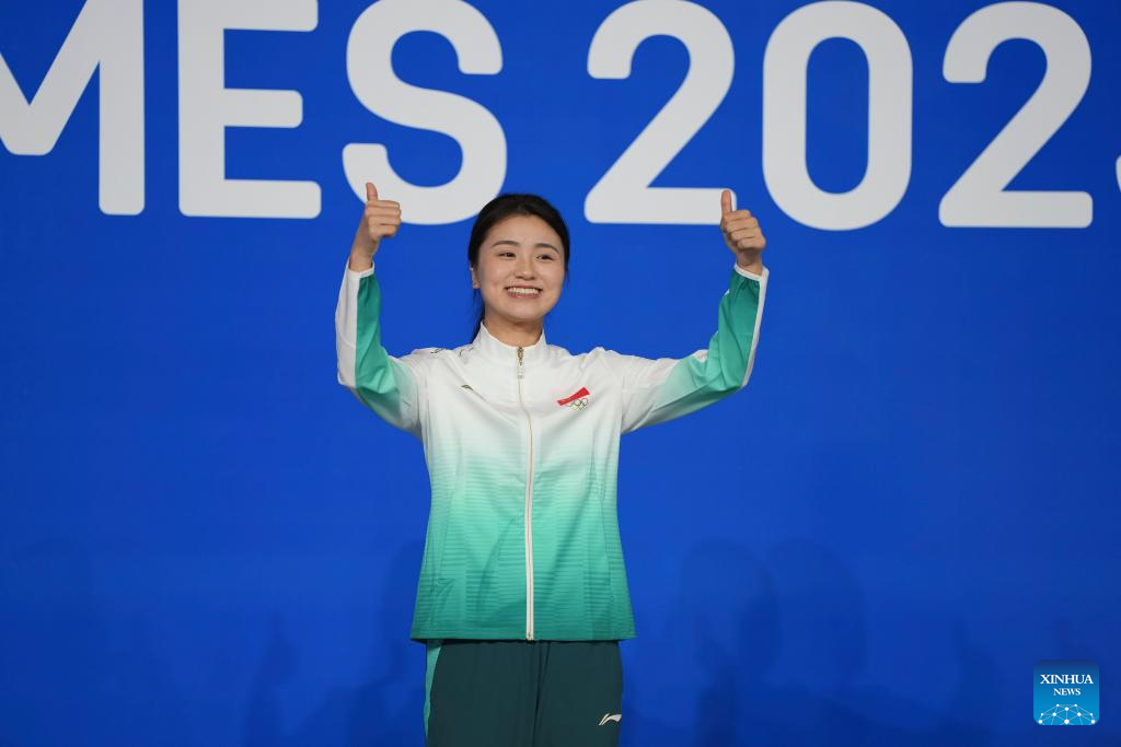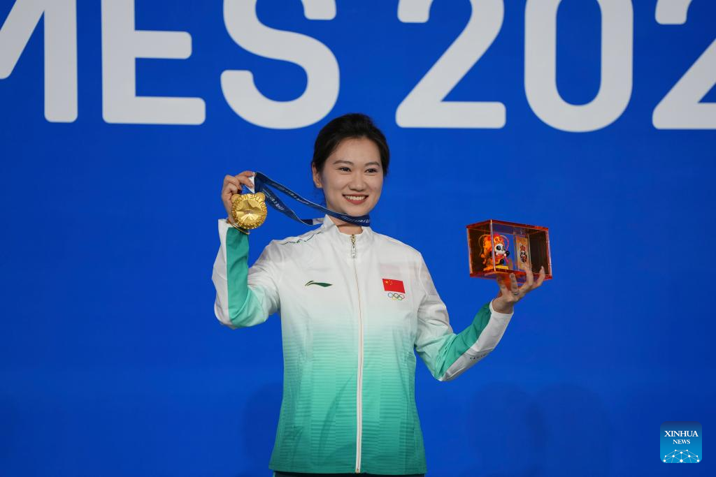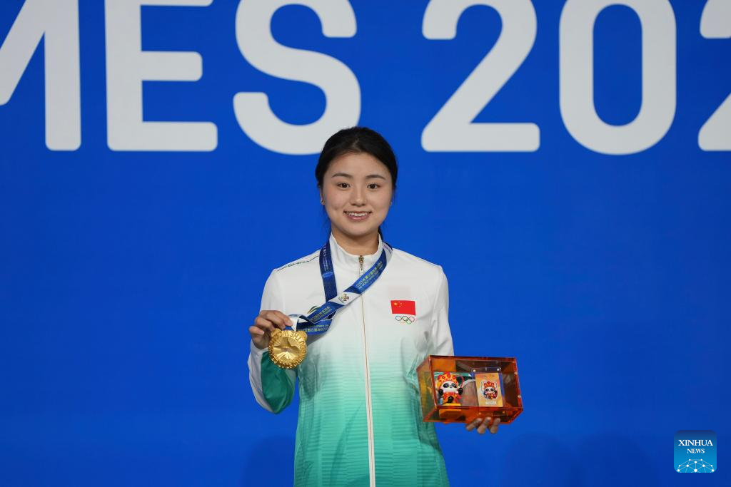 Gold medalist Bai Yulu of China poses during the awarding ceremony for Women's Six-Red Snooker of Billiards event at The World Games 2025 in Chengdu, southwest China's Sichuan Province, Aug. 14, 2025. (Xinhua/Xu Bingjie)
