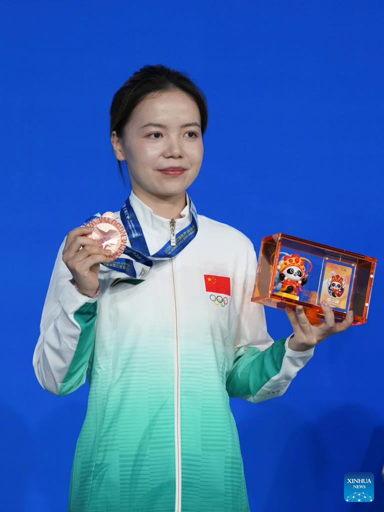Bronze medalist Tang Chunxiao of China poses during the awarding ceremony for Mixed Heyball Pool of Billiards event at The World Games 2025 in Chengdu, southwest China's Sichuan Province, Aug. 14, 2025. (Xinhua/Xu Bingjie)