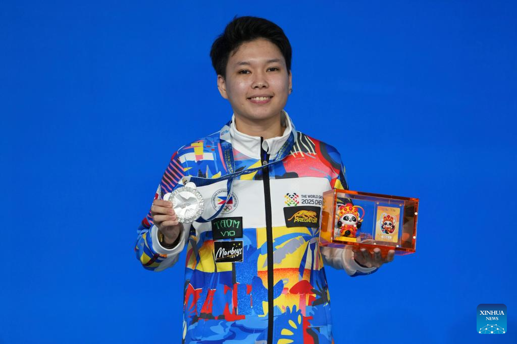 Silver medalist Chezka Centeno of the Philippines poses during the awarding ceremony for Women's Pool of Billiards event at The World Games 2025 in Chengdu, southwest China's Sichuan Province, Aug. 14, 2025. (Xinhua/Xu Bingjie)