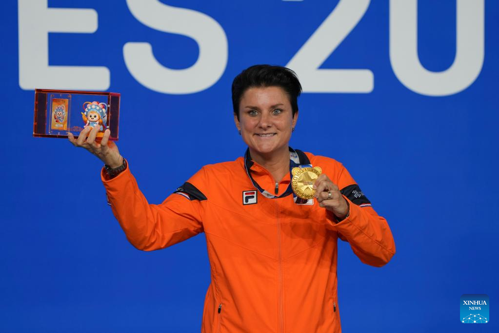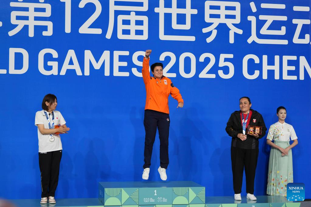 Gold medalist Therese Klompenhouwer of the Netherlands reacts during the awarding ceremony for Women's Carom Three Cushion of Billiards event at The World Games 2025 in Chengdu, southwest China's Sichuan Province, Aug. 14, 2025. (Xinhua/Xu Bingjie)