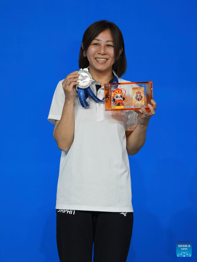 Silver medalist Miyashita Ayaka of Japan poses during the awarding ceremony for Women's Carom Three Cushion of Billiards event at The World Games 2025 in Chengdu, southwest China's Sichuan Province, Aug. 14, 2025. (Xinhua/Xu Bingjie)
