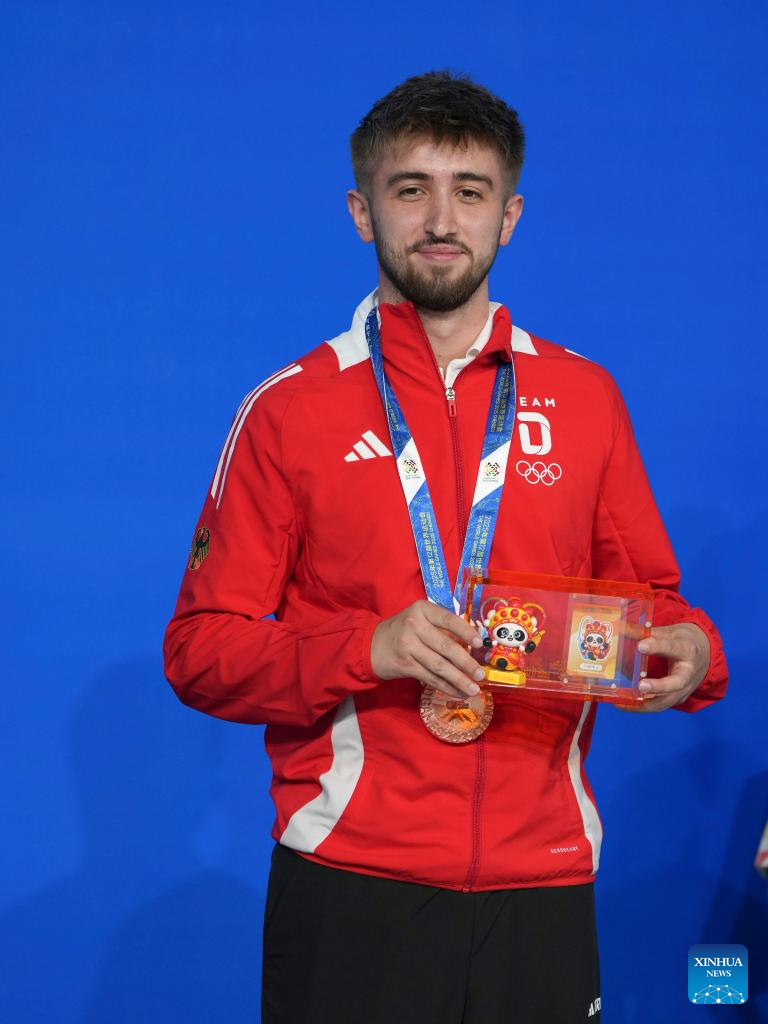 Bronze medalist Alexander Widau of Germany poses during the awarding ceremony for Men's Snooker of Billiards event at The World Games 2025 in Chengdu, southwest China's Sichuan Province, Aug. 14, 2025. (Xinhua/Xu Bingjie)