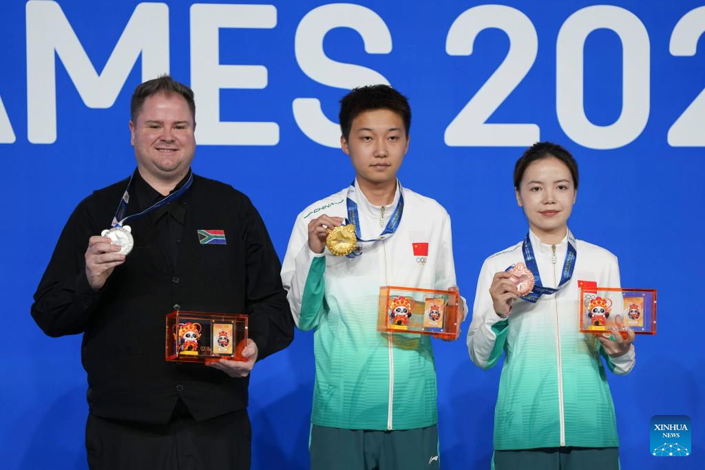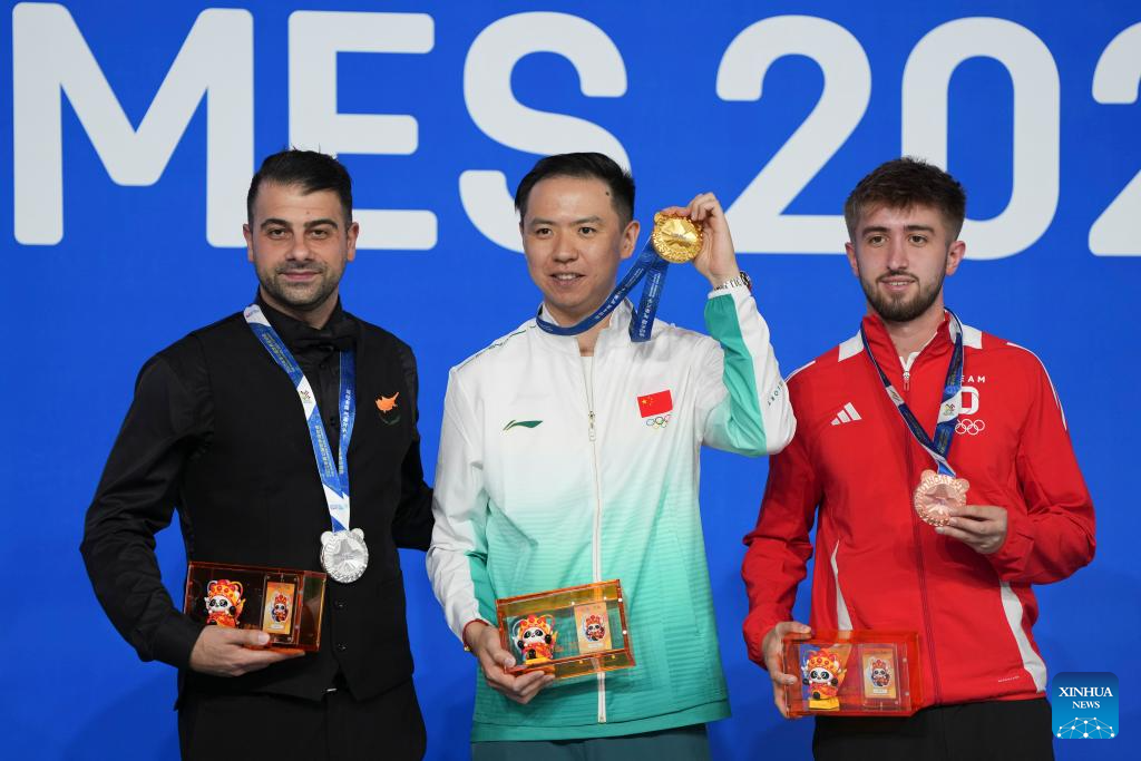 Gold medalist Xiao Guodong (C) of China, silver medalist Michael Georgiou (L) of Cyprus and bronze medalist Alexander Widau of Germany pose during the awarding ceremony for Men's Snooker of Billiards event at The World Games 2025 in Chengdu, southwest China's Sichuan Province, Aug. 14, 2025. (Xinhua/Xu Bingjie)