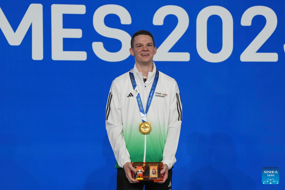 Gold medalist Oliver Szolnoki of Hungary poses during the awarding ceremony for Men's Pool of Billiards event at The World Games 2025 in Chengdu, southwest China's Sichuan Province, Aug. 14, 2025. (Xinhua/Xu Bingjie)