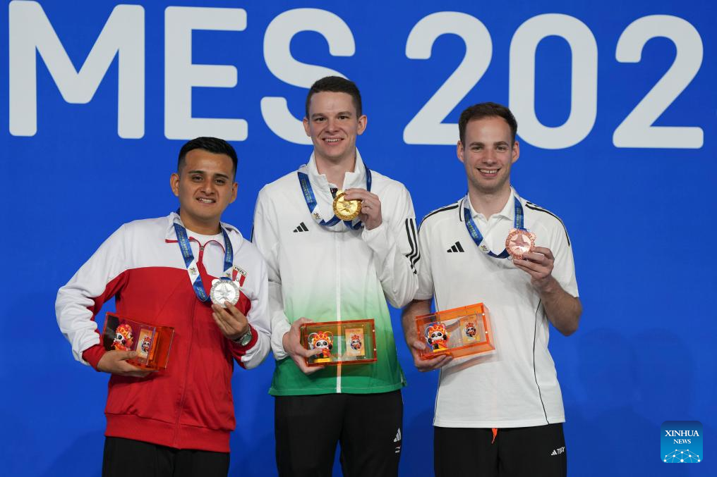 Gold medalist Oliver Szolnoki (C) of Hungary, silver medalist Gerson Martinez (L) of Peru and bronze medalist Joshua Filler of Germany pose during the awarding ceremony for Men's Pool of Billiards event at The World Games 2025 in Chengdu, southwest China's Sichuan Province, Aug. 14, 2025. (Xinhua/Xu Bingjie)