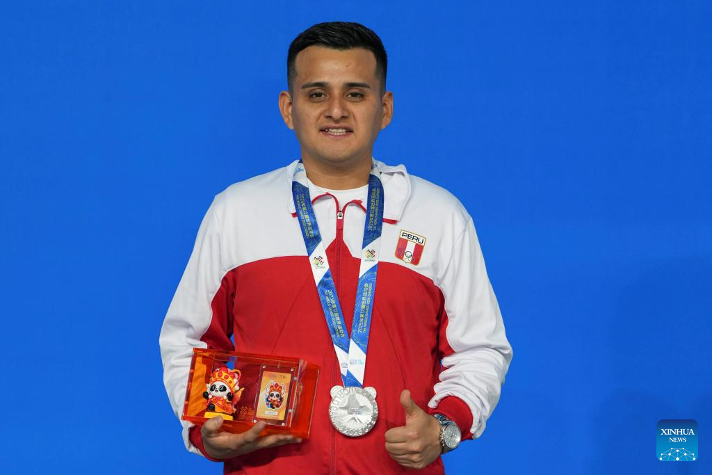 Silver medalist Gerson Martinez of Peru poses during the awarding ceremony for Men's Pool of Billiards event at The World Games 2025 in Chengdu, southwest China's Sichuan Province, Aug. 14, 2025. (Xinhua/Xu Bingjie)
