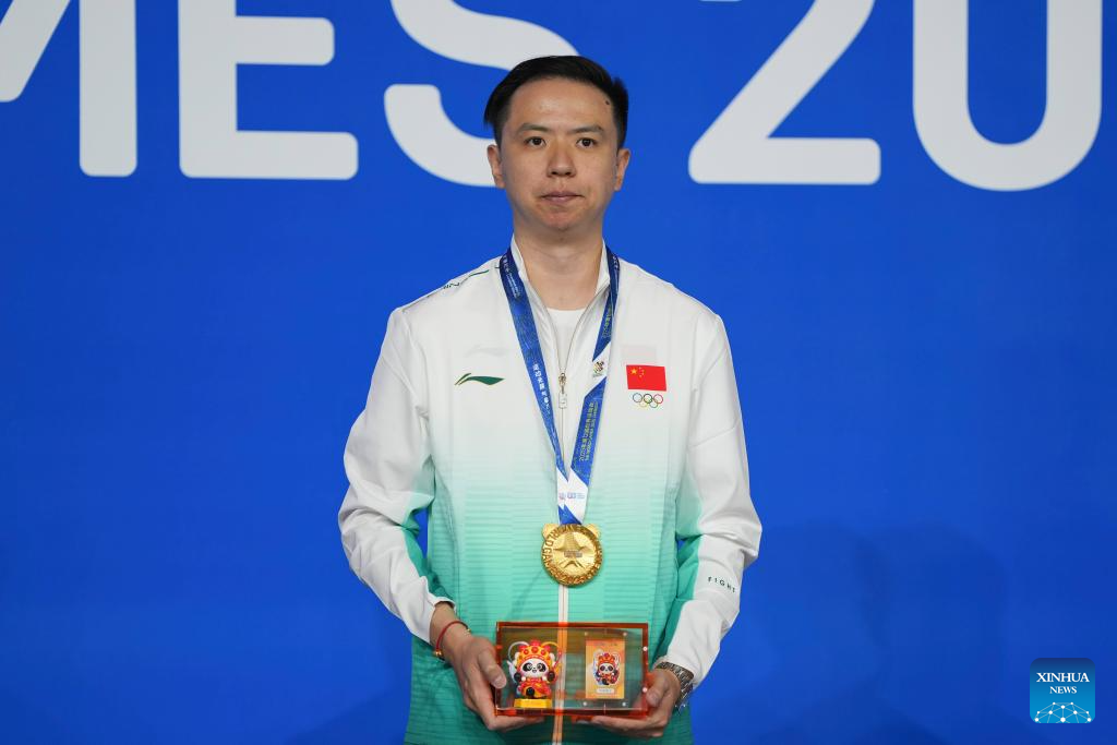 Gold medalist Xiao Guodong of China reacts during the awarding ceremony for Men's Snooker of Billiards event at The World Games 2025 in Chengdu, southwest China's Sichuan Province, Aug. 14, 2025. (Xinhua/Xu Bingjie)