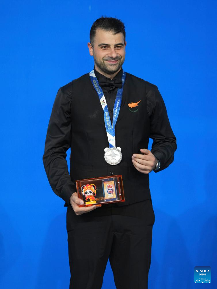 Silver medalist Michael Georgiou of Cyprus poses during the awarding ceremony for Men's Snooker of Billiards event at The World Games 2025 in Chengdu, southwest China's Sichuan Province, Aug. 14, 2025. (Xinhua/Xu Bingjie)