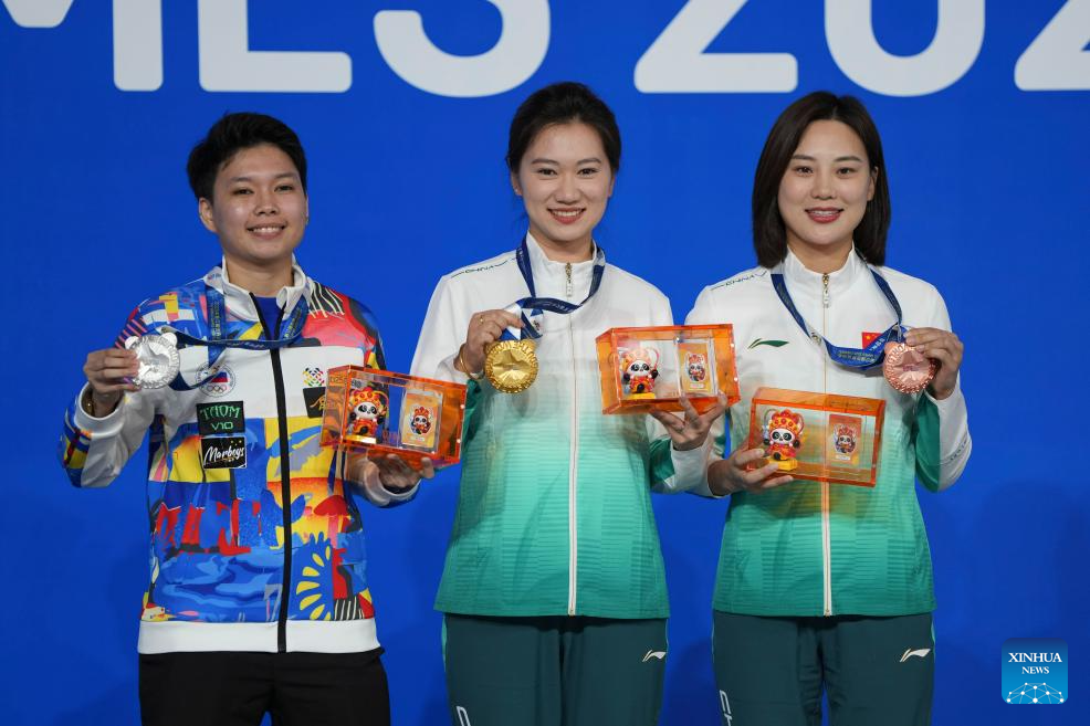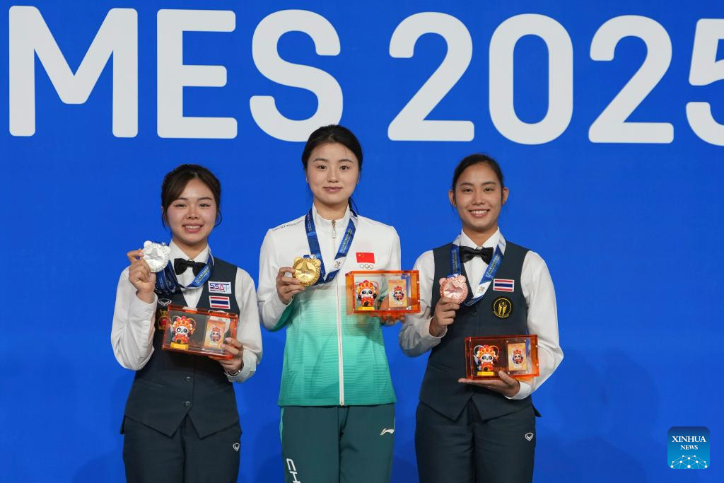 Gold medalist Han Yu (C) of China, silver medalist Chezka Centeno (L) of the Philippines and bronze medalist Liu Shasha of China pose during the awarding ceremony for Women's Pool of Billiards event at The World Games 2025 in Chengdu, southwest China's Sichuan Province, Aug. 14, 2025. (Xinhua/Xu Bingjie)