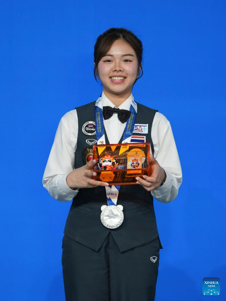 Silver medalist Narucha Phoemphul of Thailand poses during the awarding ceremony for Women's Six-Red Snooker of Billiards event at The World Games 2025 in Chengdu, southwest China's Sichuan Province, Aug. 14, 2025. (Xinhua/Xu Bingjie)