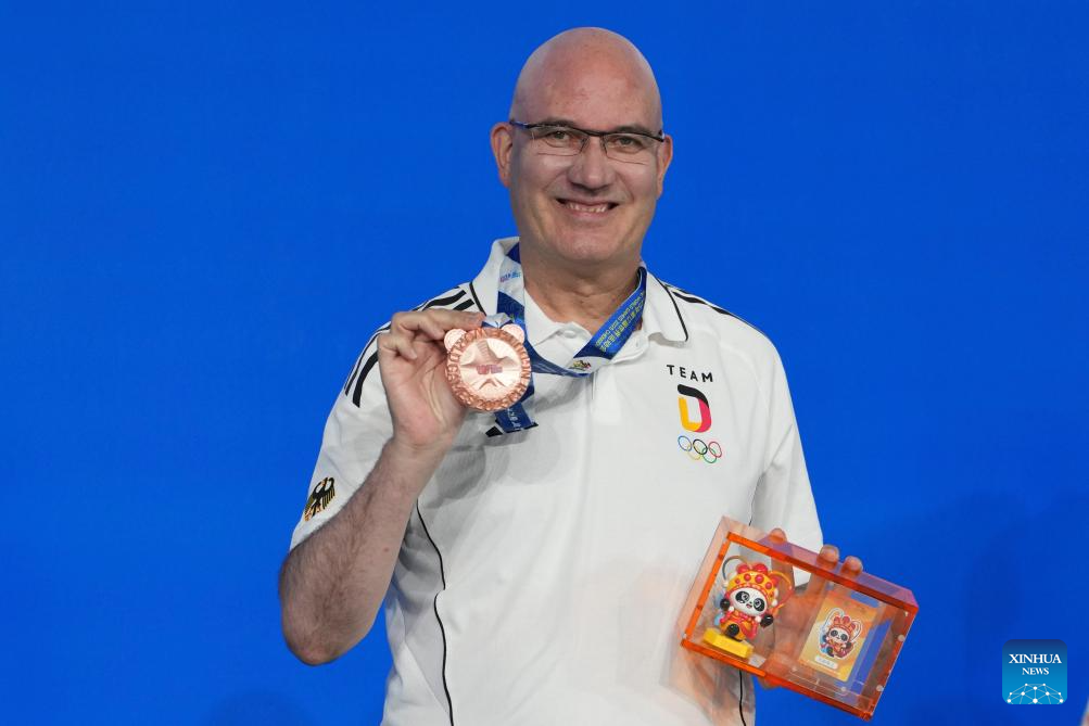 Bronze medalist Martin Horn of Germany poses during the awarding ceremony for Men's Carom Three Cushion of Billiards event at The World Games 2025 in Chengdu, southwest China's Sichuan Province, Aug. 14, 2025. (Xinhua/Xu Bingjie)