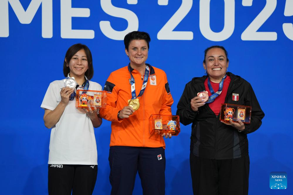 Gold medalist Therese Klompenhouwer (C) of the Netherlands, silver medalist Miyashita Ayaka (L) of Japan and bronze medalist Jackeline Perez of Peru pose during the awarding ceremony for Women's Carom Three Cushion of Billiards event at The World Games 2025 in Chengdu, southwest China's Sichuan Province, Aug. 14, 2025. (Xinhua/Xu Bingjie)