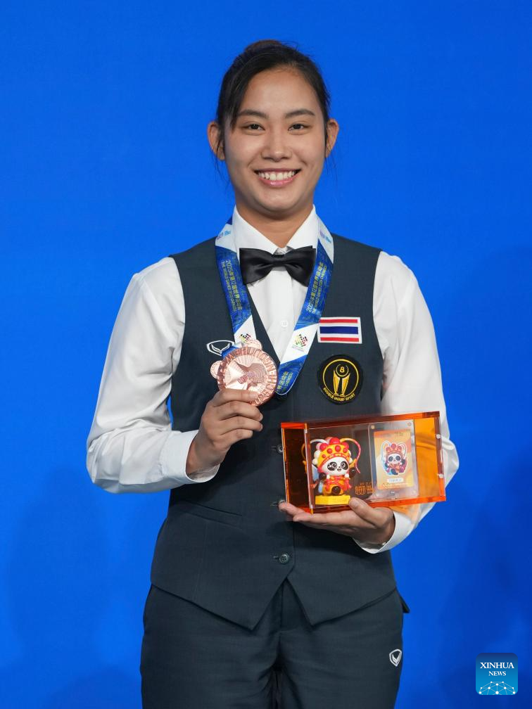 Bronze medalist Ploychompoo Laokiatphong of Thailand poses during the awarding ceremony for Women's Six-Red Snooker of Billiards event at The World Games 2025 in Chengdu, southwest China's Sichuan Province, Aug. 14, 2025. (Xinhua/Xu Bingjie)