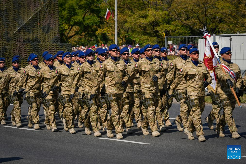 Soldiers march in formation during a military parade of Armed Forces Day in Warsaw, Poland, on Aug. 15, 2025. Poland celebrated its Armed Forces Day on Friday with a grand parade along the Vistula River in Warsaw, featuring more than 4,000 soldiers. (Photo by Jaap Arriens/Xinhua)