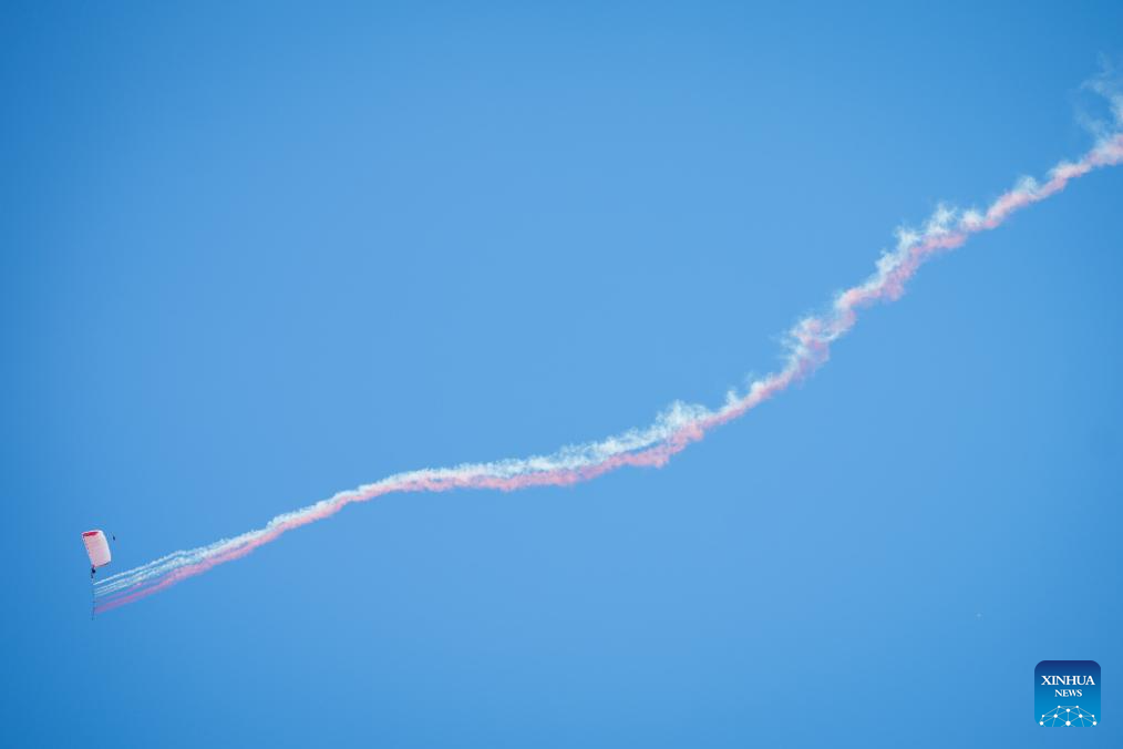A paratrooper performs during a military parade of Armed Forces Day in Warsaw, Poland, on Aug. 15, 2025. Poland celebrated its Armed Forces Day on Friday with a grand parade along the Vistula River in Warsaw, featuring more than 4,000 soldiers. (Photo by Jaap Arriens/Xinhua)