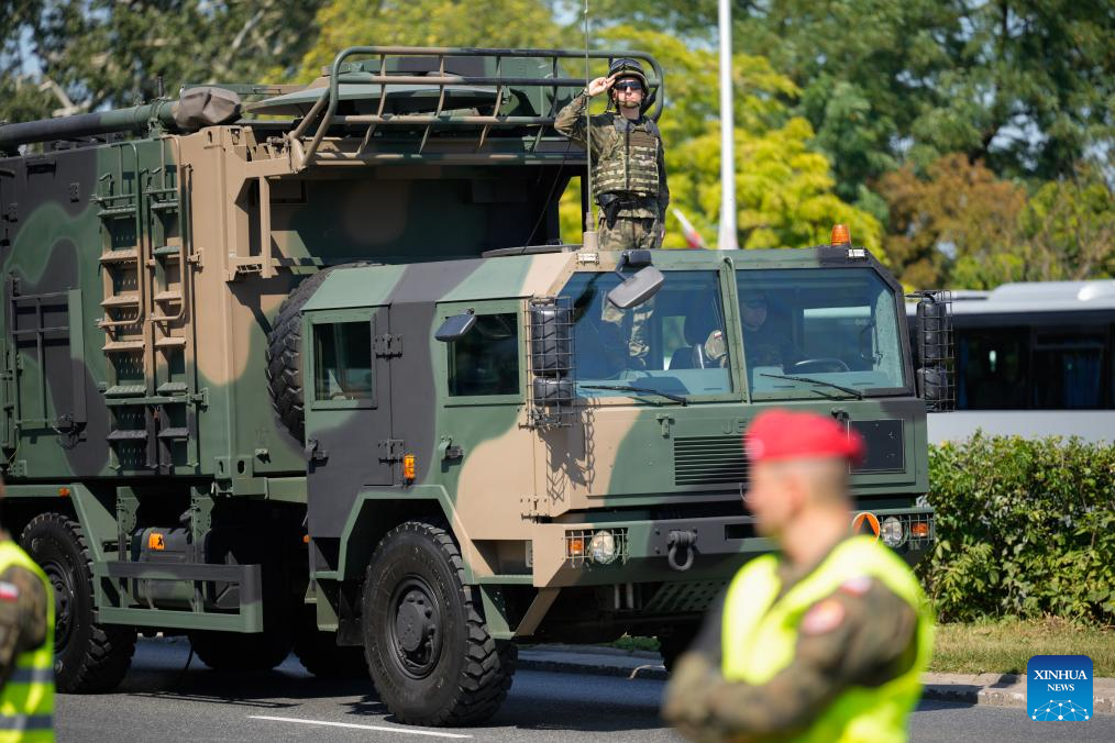 A Polish soldier salutes from atop a military vehicle during a military parade of Armed Forces Day in Warsaw, Poland, on Aug. 15, 2025. Poland celebrated its Armed Forces Day on Friday with a grand parade along the Vistula River in Warsaw, featuring more than 4,000 soldiers. (Photo by Jaap Arriens/Xinhua)