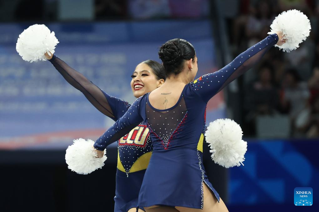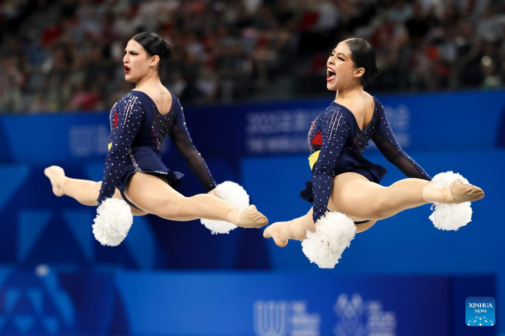 Jennifer Garcia/Fabiana Velez of Ecuador perform during the Cheerleading Pom Doubles Final at The World Games 2025 in Chengdu, southwest China's Sichuan Province, Aug. 16, 2025. (Xinhua/Liang Xu)