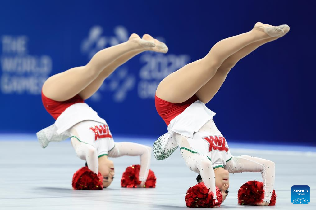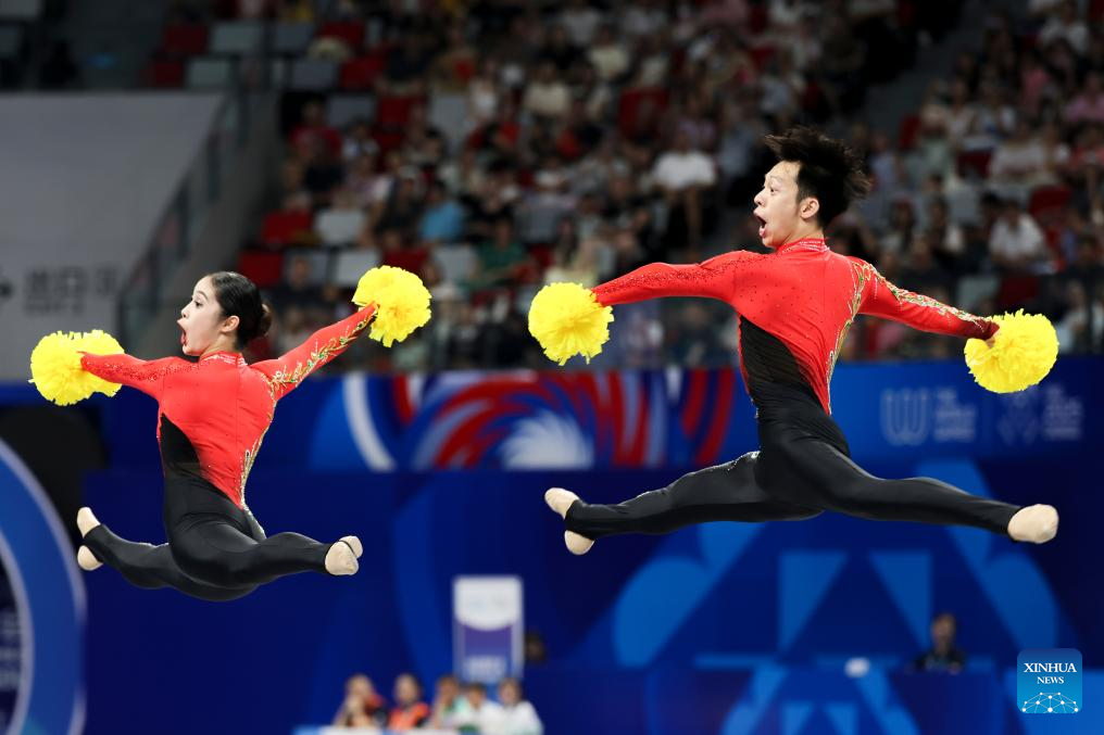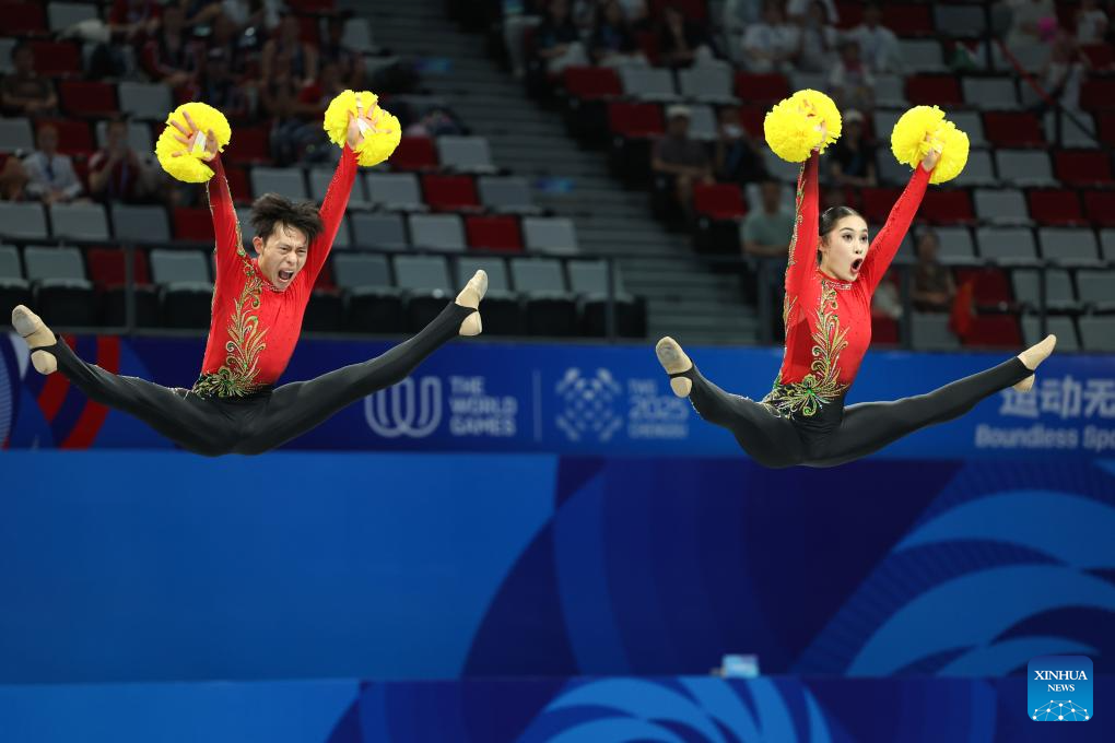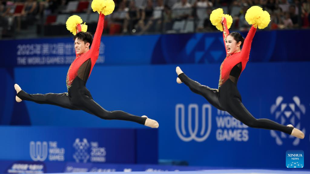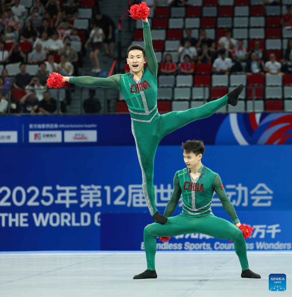 Li Jiaxin/Wang Yazhou of China perform during the Cheerleading Pom Doubles Final at The World Games 2025 in Chengdu, southwest China's Sichuan Province, Aug. 16, 2025. (Xinhua/Liang Xu)
