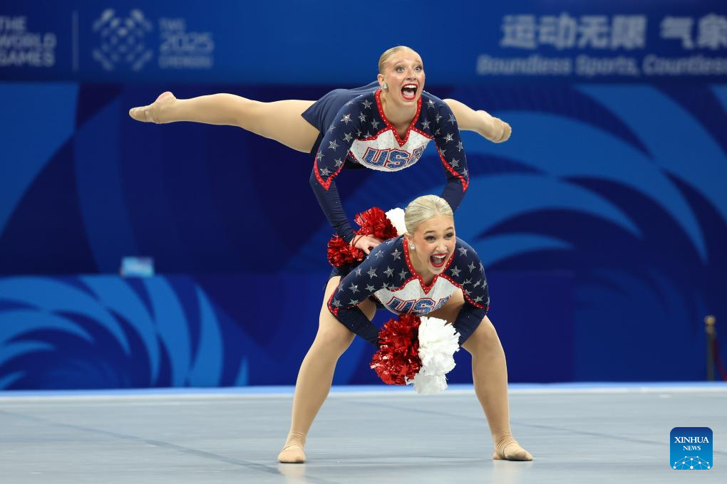 Sydney Martin/Allison Hoeft of the United States perform during the Cheerleading Pom Doubles Final at The World Games 2025 in Chengdu, southwest China's Sichuan Province, Aug. 16, 2025. (Xinhua/Liang Xu)