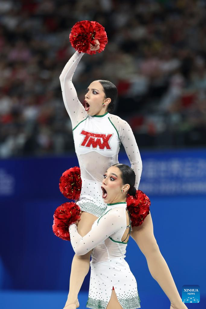Maria Reyes/Montse Gonzalez of Mexico perform during the Cheerleading Pom Doubles Final at The World Games 2025 in Chengdu, southwest China's Sichuan Province, Aug. 16, 2025. (Xinhua/Wang Xiang)