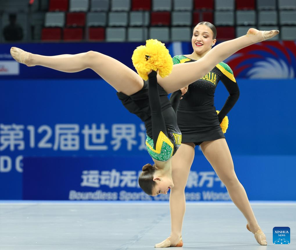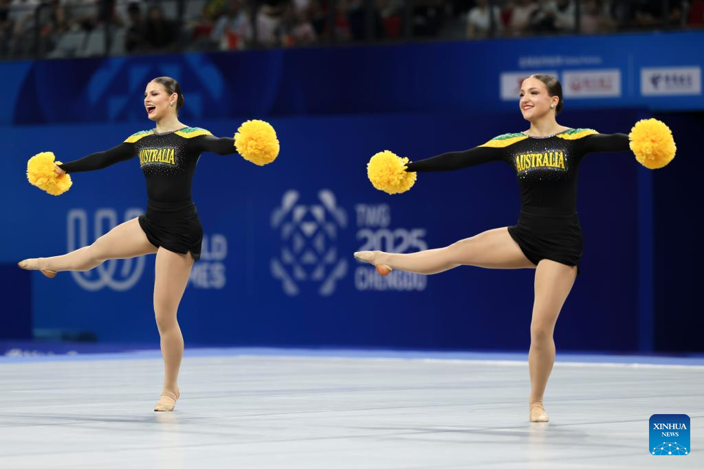 Shayla Myerscough/Emily Growdon of Australia perform during the Cheerleading Pom Doubles Final at The World Games 2025 in Chengdu, southwest China's Sichuan Province, Aug. 16, 2025. (Xinhua/Wang Xiang)