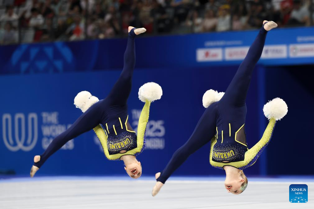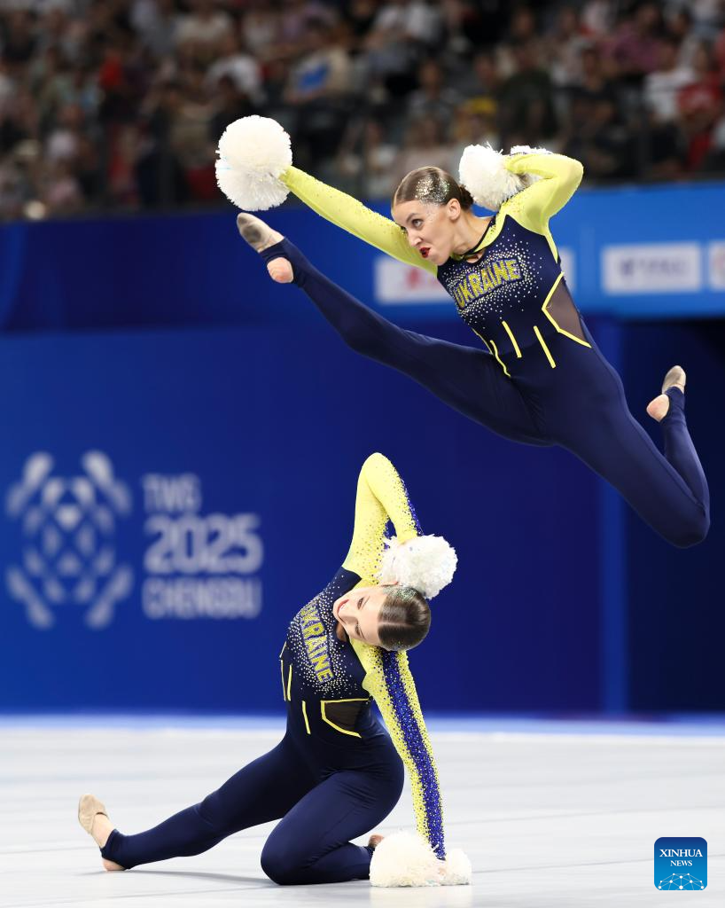 Anastasiia Maloshenko/Yelyzaveta Tymofieieva of Ukraine perform during the Cheerleading Pom Doubles Final at The World Games 2025 in Chengdu, southwest China's Sichuan Province, Aug. 16, 2025. (Xinhua/Wang Xiang)