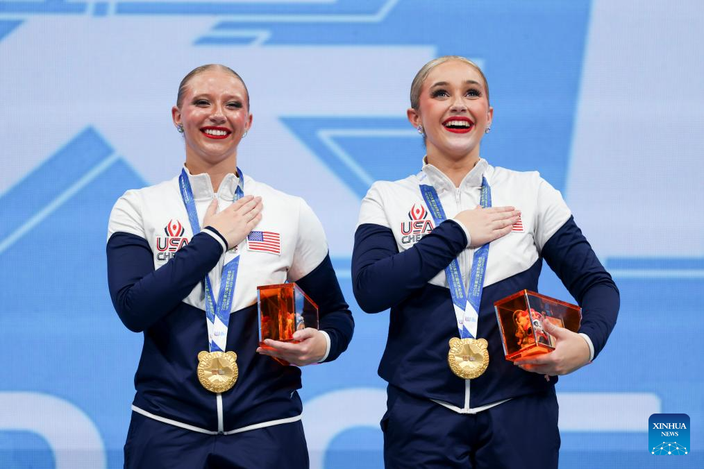 Gold medalists Sydney Martin/Allison Hoeft of the United States react during the awarding ceremony for the Cheerleading Pom Doubles Final at The World Games 2025 in Chengdu, southwest China's Sichuan Province, Aug. 16, 2025. (Xinhua/Wang Xiang)