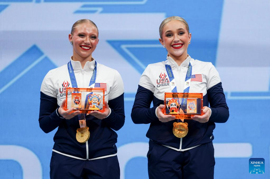 Gold medalists Sydney Martin/Allison Hoeft of the United States pose during the awarding ceremony for the Cheerleading Pom Doubles Final at The World Games 2025 in Chengdu, southwest China's Sichuan Province, Aug. 16, 2025. (Xinhua/Wang Xiang)
