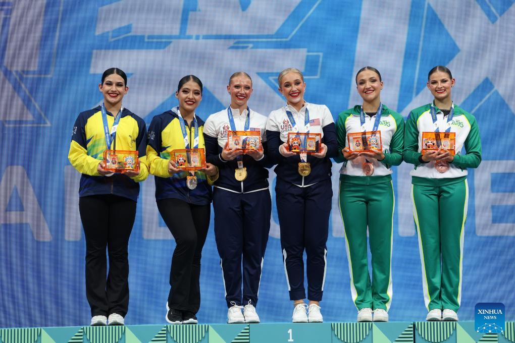 Silver medalists Jennifer Garcia/Fabiana Velez of Ecuador, gold medalists Sydney Martin/Allison Hoeft of the United States and bronze medalists Shayla Myerscough/Emily Growdon of Australia (L to R) are seen during the awarding ceremony for the Cheerleading Pom Doubles Final at The World Games 2025 in Chengdu, southwest China's Sichuan Province, Aug. 16, 2025. (Xinhua/Wang Xiang)