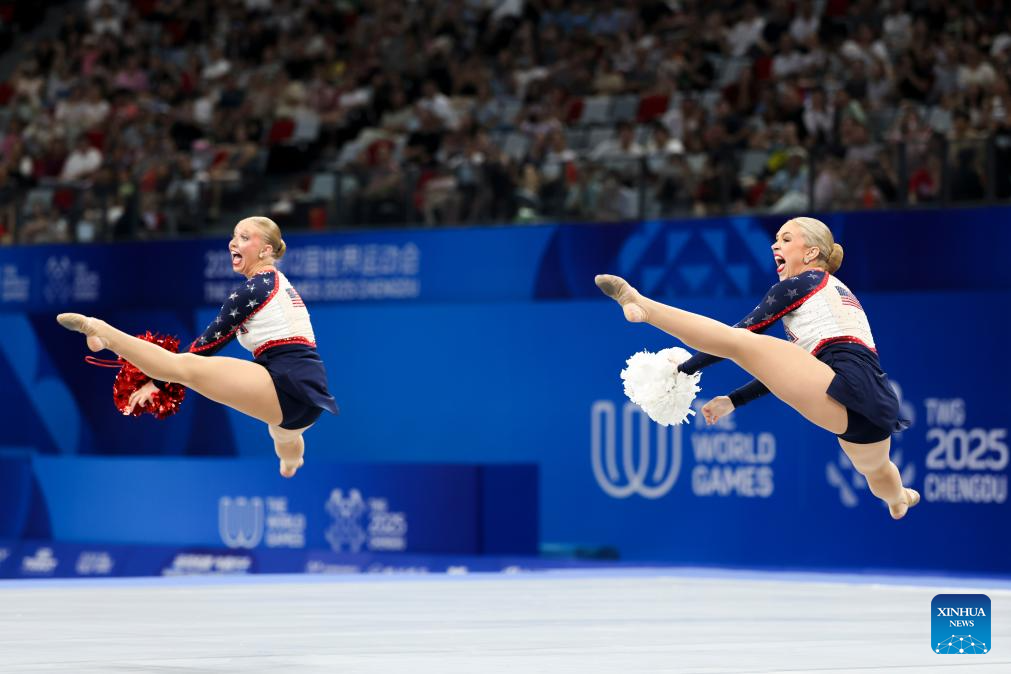 Sydney Martin/Allison Hoeft of the United States perform during the Cheerleading Pom Doubles Final at The World Games 2025 in Chengdu, southwest China's Sichuan Province, Aug. 16, 2025. (Xinhua/Wang Xiang)
