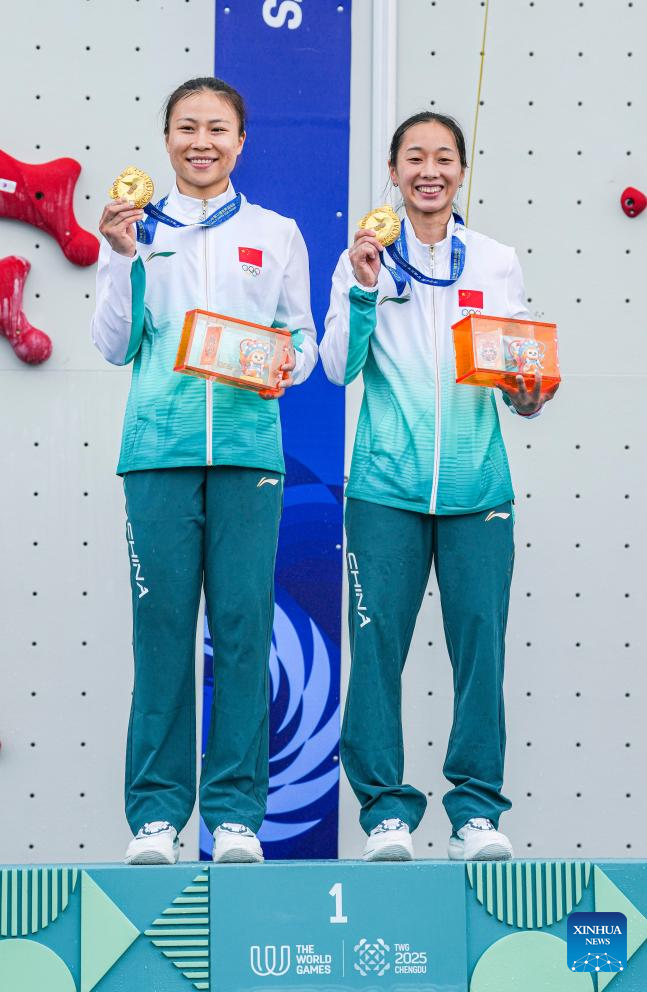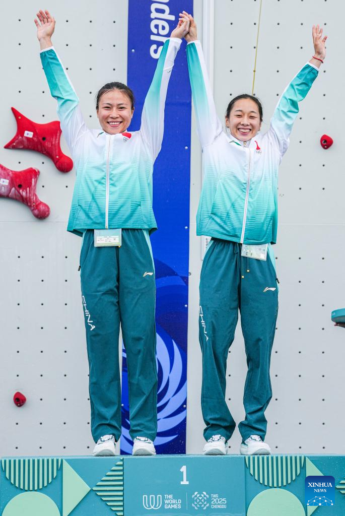 Gold medalists Deng Lijuan(L)/Zhou Yafei of team China 1 celebrate during the victory ceremony for the Sport Climbing Women's Speed Relay event at The World Games 2025 in Chengdu, southwest China's Sichuan Province, Aug. 16, 2025.They set a new world record of the event. (Xinhua/Tenzin Nyida)