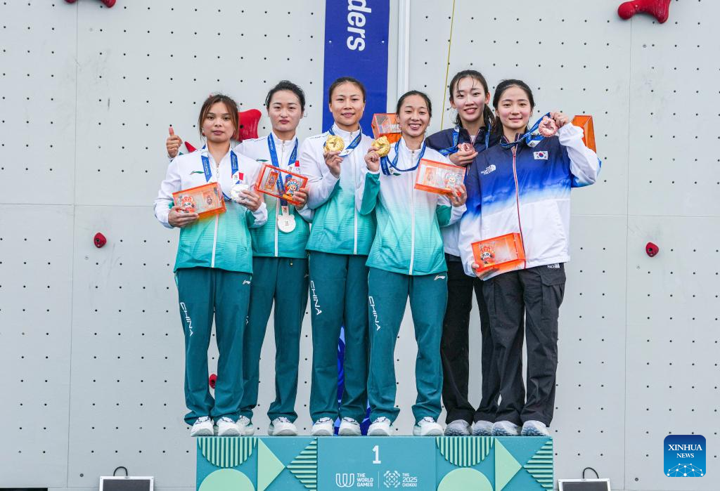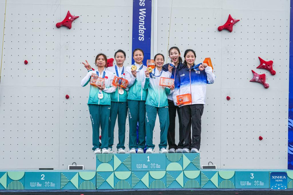 Gold medalists Deng Lijuan (3rd L)/Zhou Yafei(3rd R) of team China 1, silver medalists Qin Yumei(1st L)/Zhang Shaoqin(2nd L) of team China 2 and bronze medalists Jeong Jimin (2nd R)/Sung Hanareum of team South Korea 1 pose during the victory ceremony for the Sport Climbing Women's Speed Relay event at The World Games 2025 in Chengdu, southwest China's Sichuan Province, Aug. 16, 2025. (Xinhua/Tenzin Nyida)