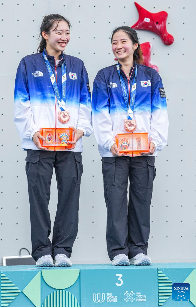 Bronze medalists Jeong Jimin (L)/Sung Hanareum of team South Korea 1 celebrate during the victory ceremony for the Sport Climbing Women's Speed Relay event at The World Games 2025 in Chengdu, southwest China's Sichuan Province, Aug. 16, 2025. (Xinhua/Tenzin Nyida)