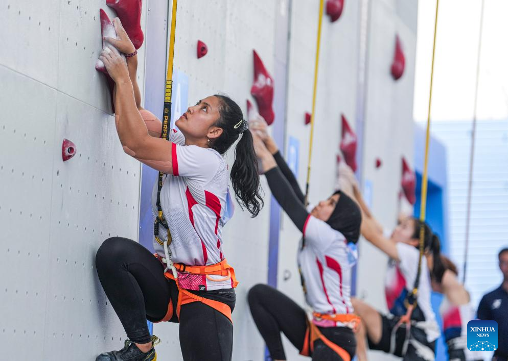 Desak Made Rita Kusuma Dewi (L) competes during the Sport Climbing Women's Speed Relay Bronze Medal Match between Jeong Jimin/Sung Hanareum of team South Korea 1 and Desak Made Rita Kusuma Dewi/Rajiah Sallsabillah of Indonesia 1 at The World Games 2025 in Chengdu, southwest China's Sichuan Province, Aug. 16, 2025. (Xinhua/Tenzin Nyida)