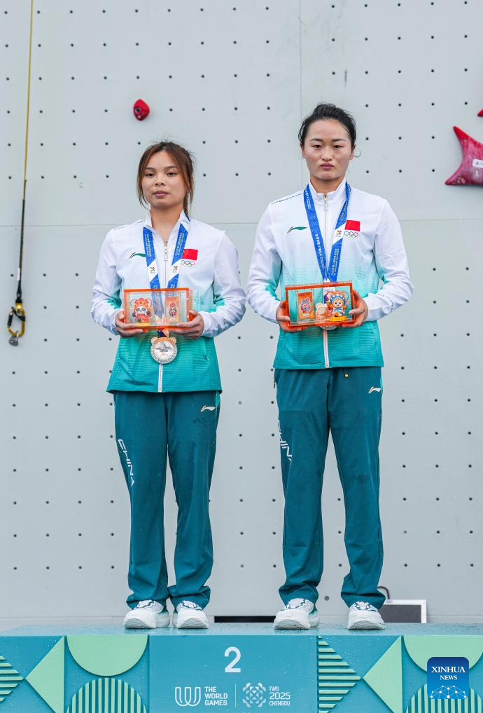 Silver medalists Qin Yumei(L)/Zhang Shaoqin of team China 2 pose during the victory ceremony for the Sport Climbing Women's Speed Relay event at The World Games 2025 in Chengdu, southwest China's Sichuan Province, Aug. 16, 2025. (Xinhua/Tenzin Nyida)