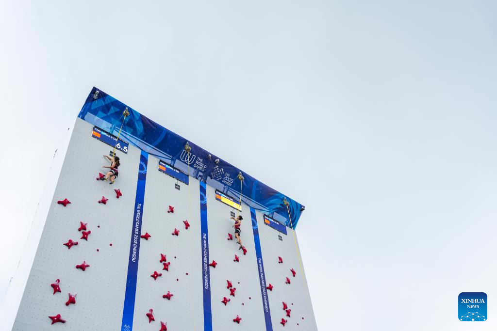 Qin Yumei (L) and Zhou Yafei compete during the Sport Climbing Women's Speed Relay Gold Medal Match between Deng Lijuan/Zhou Yafei of team China 1 and Qin Yumei/Zhang Shaoqin of team China 2 at The World Games 2025 in Chengdu, southwest China's Sichuan Province, Aug. 16, 2025. (Xinhua/Tenzin Nyida)