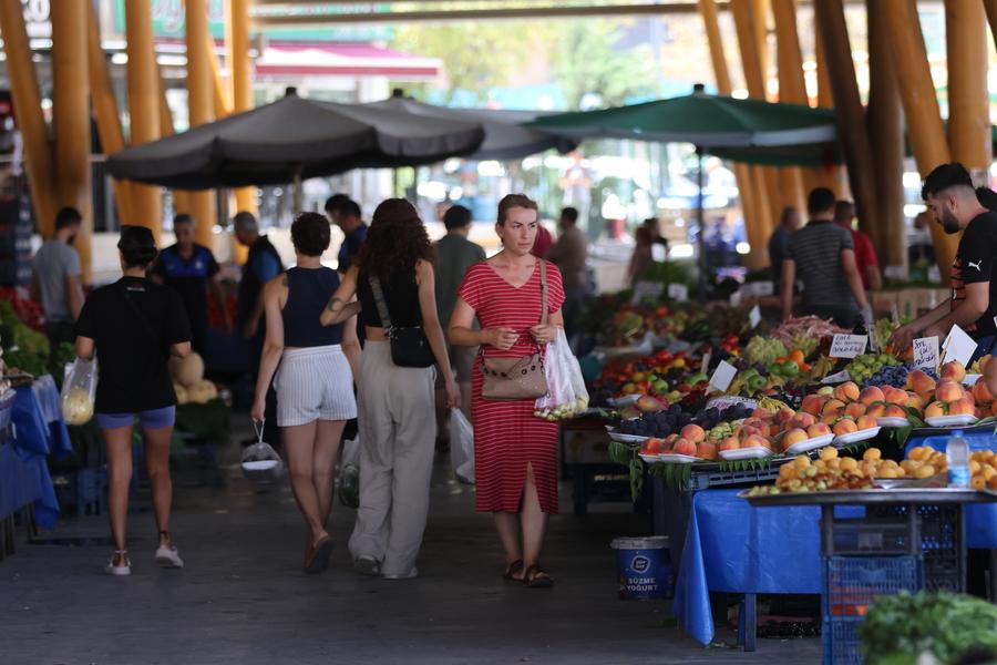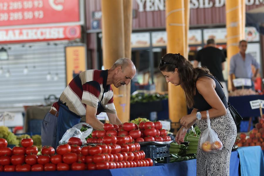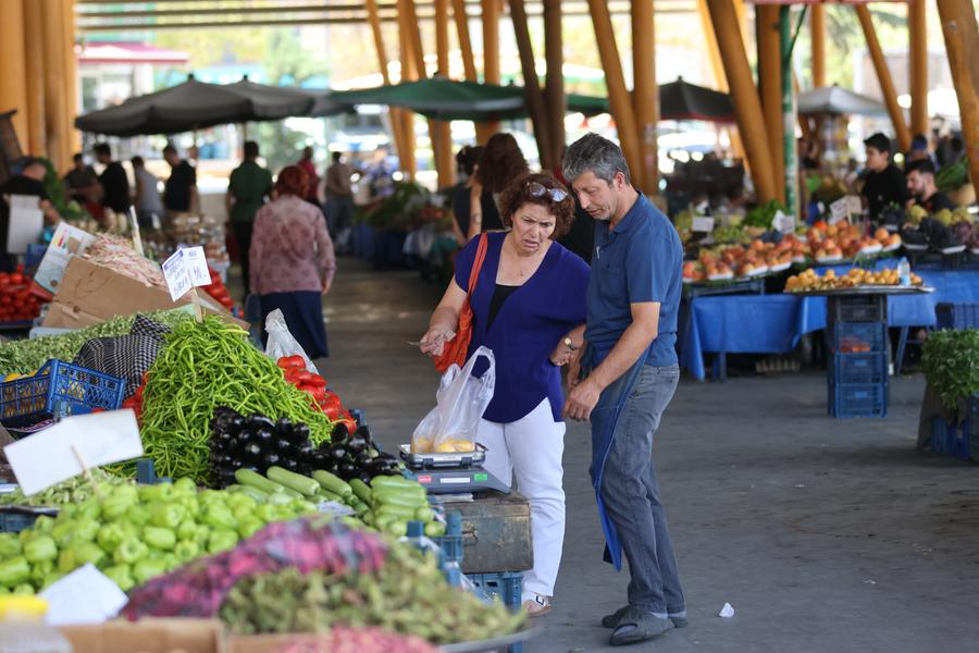 ANKARA, Aug. 15 (Xinhua) -- In the bustling open-air market of capital city Ankara's 100th Yil district, shoppers weave between stalls under a patchwork of canvas awnings, their eyes darting from price tags to their shopping lists.
