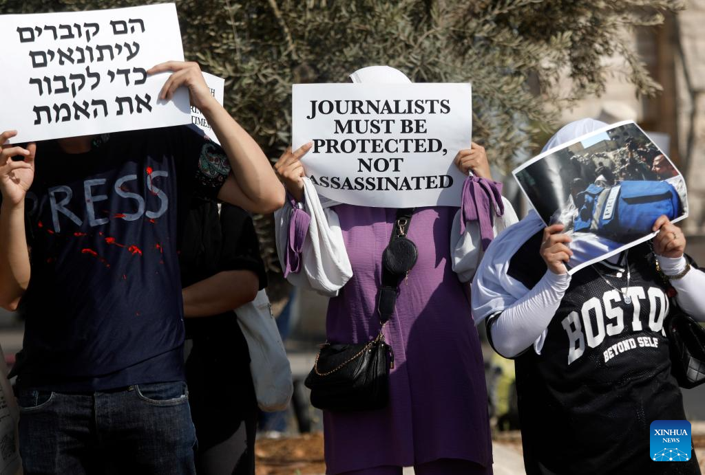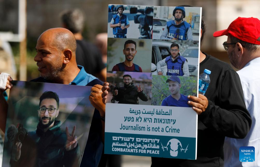 Palestinian and Israeli people hold placards and photos during a protest against Israeli army's killing of journalists, in the city of Beit Jala near Bethlehem, in southern West Bank, on Aug. 15, 2025. The United Nations (UN) on Monday condemned the killing of six Palestinian journalists in Sunday's Israeli airstrike on Gaza City as a "grave breach of international humanitarian law."