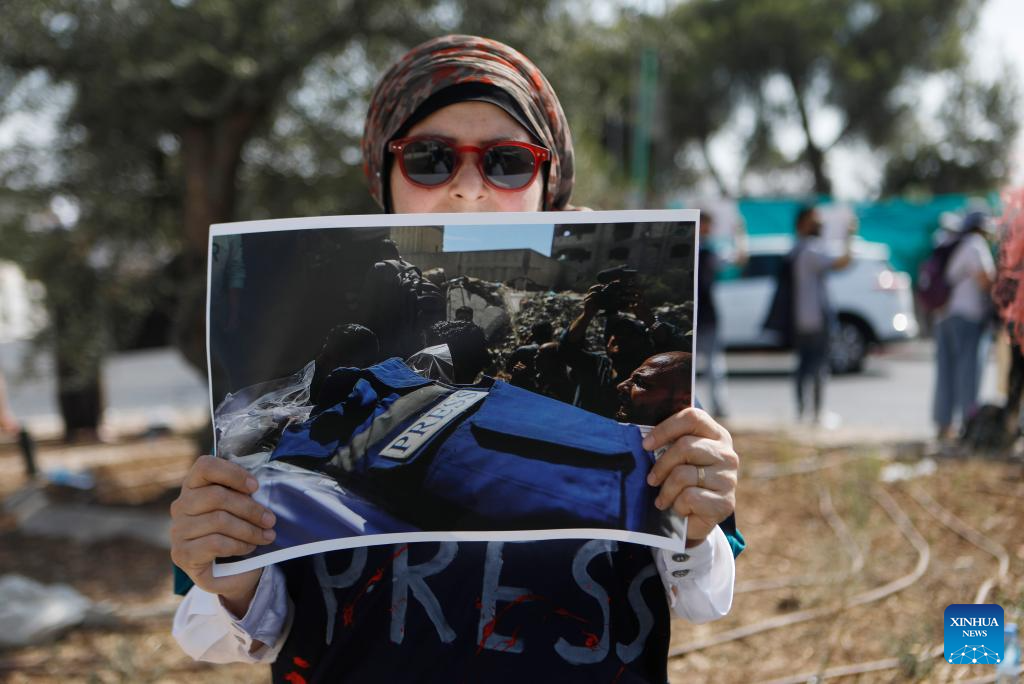 A woman shows a photo during a protest against Israeli army's killing of journalists, in the city of Beit Jala near Bethlehem, in southern West Bank, on Aug. 15, 2025. The United Nations (UN) on Monday condemned the killing of six Palestinian journalists in Sunday's Israeli airstrike on Gaza City as a "grave breach of international humanitarian law."