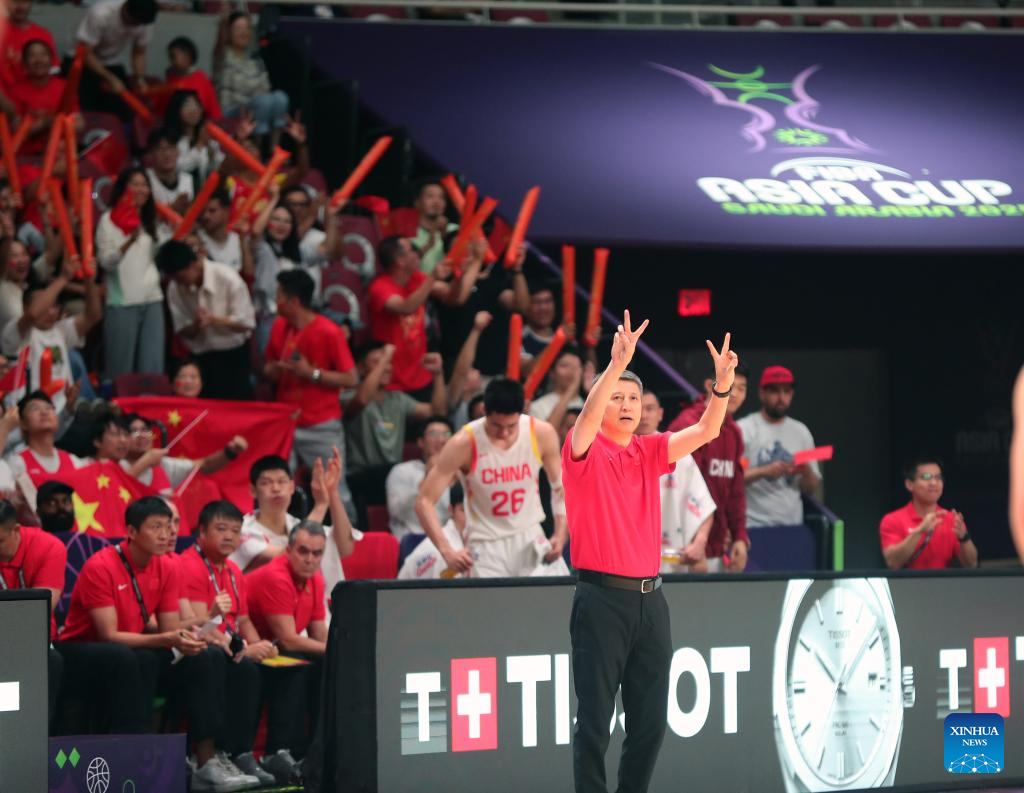 Guo Shiqiang (R), head coach of China, celebrates scoring during the semifinal match between China and New Zealand at the FIBA Asia Cup 2025 in Jeddah, Saudi Arabia, Aug. 16, 2025. (Xinhua/Wang Dongzhen)