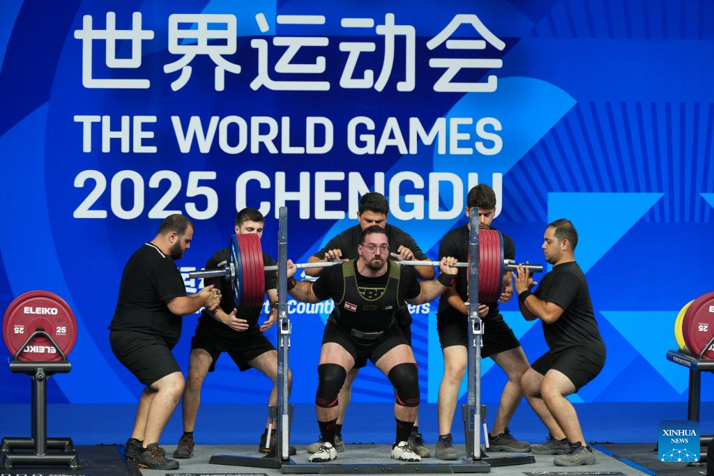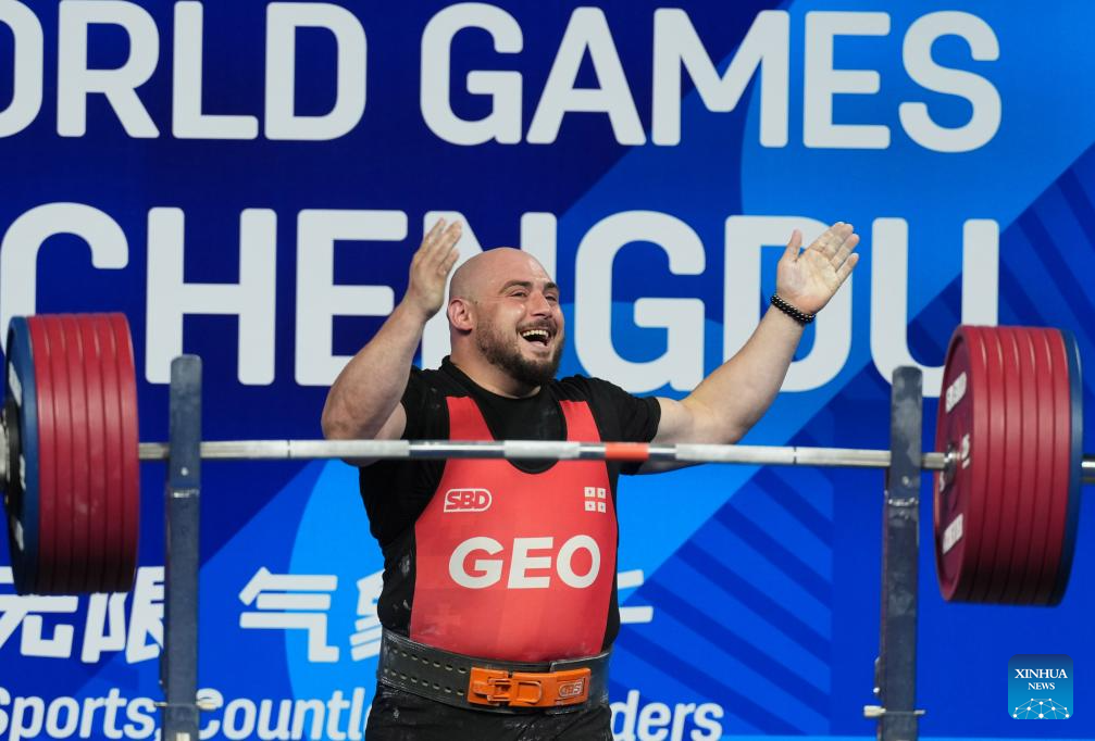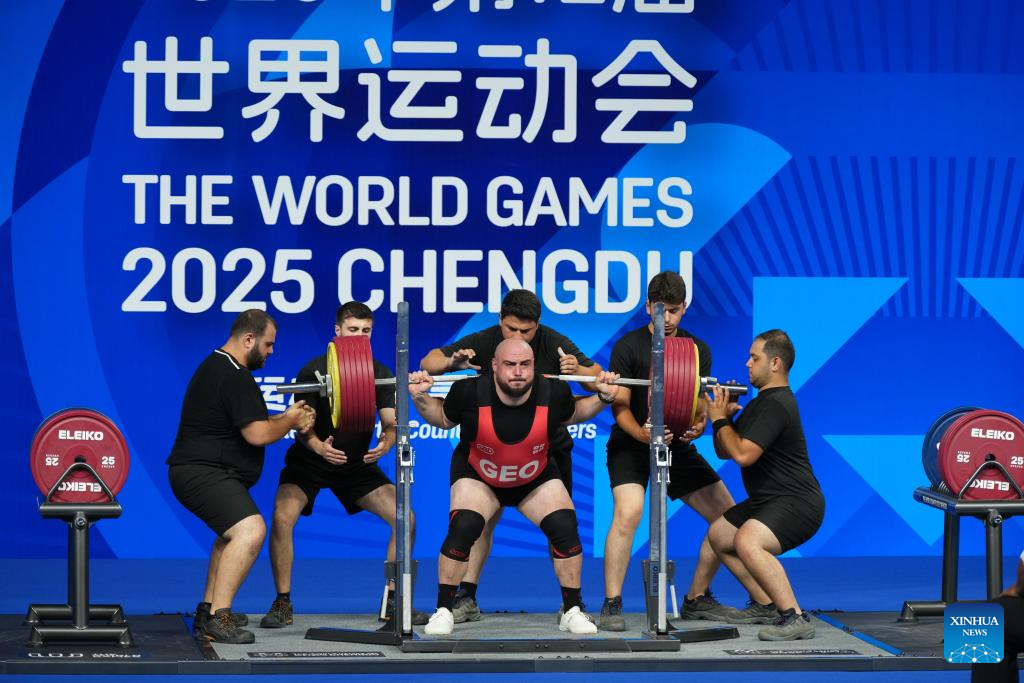 Temuri Samkharadze of Georgia competes during the Men's Super Heavyweight Final of Powerlifting event at The World Games 2025 in Chengdu, southwest China's Sichuan Province, Aug. 15, 2025. (Xinhua/Xu Suhui)