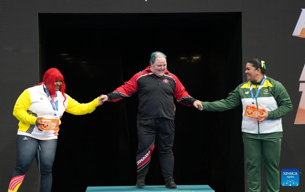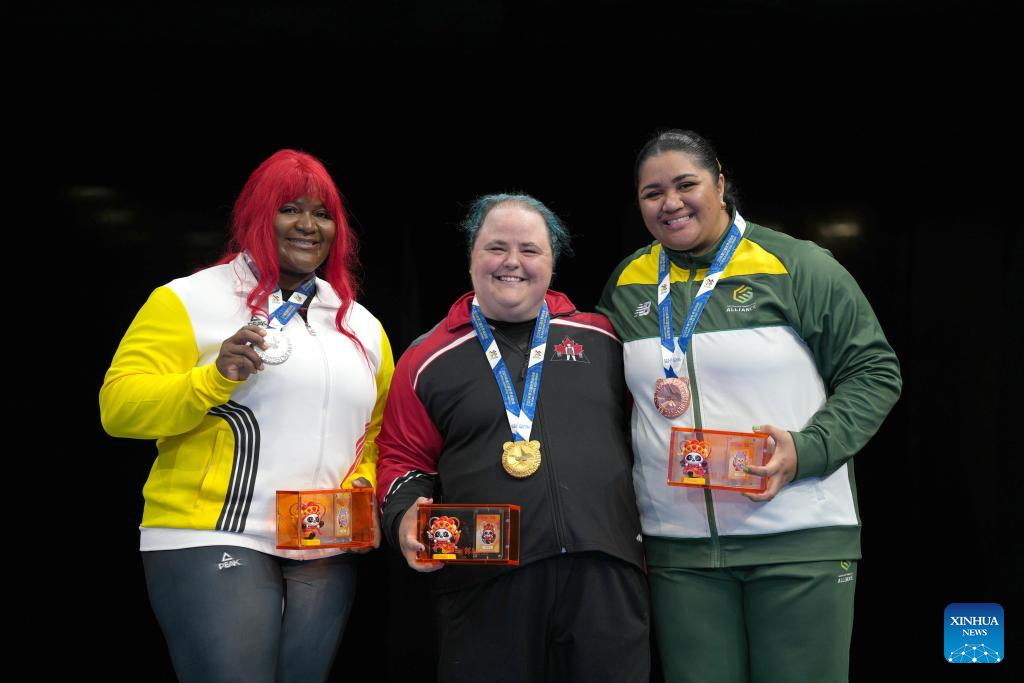 Gold medalist Brittany Dayle Schlater (C) of Canada, silver medalist Sonita Kyen Muluh (L) of Belgium and bronze medalist Natalie Soli'Ai Laalaai of Australia react during the victory ceremony for the Women's Super Heavyweight of Powerlifting event at The World Games 2025 in Chengdu, southwest China's Sichuan Province, Aug. 15, 2025. (Xinhua/Xu Suhui)