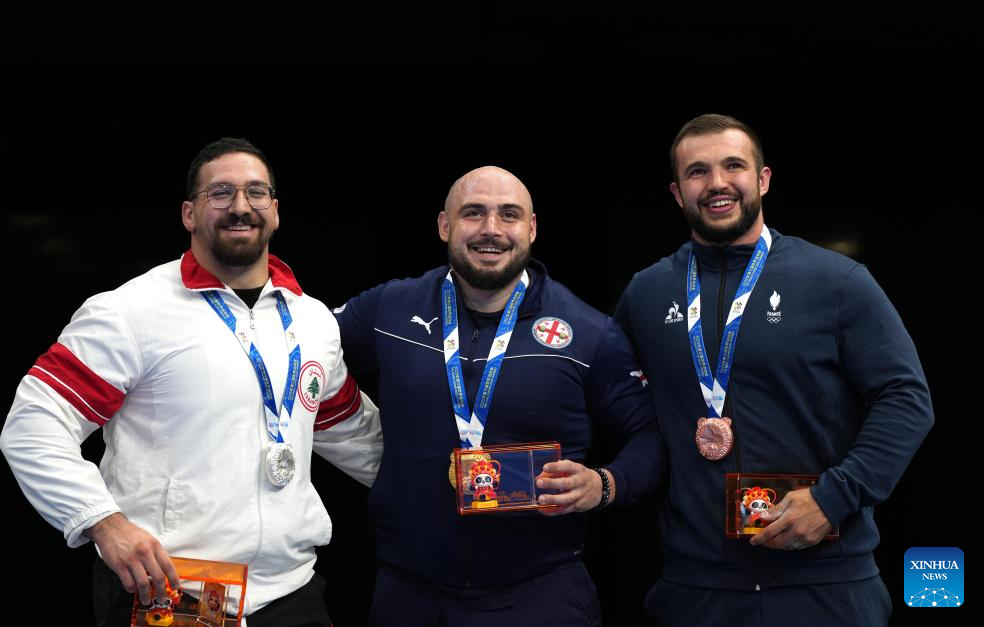 Gold medalist Temuri Samkharadze (C) of Georgia, silver medalist Etienne El Chaer (L) of Lebanon and bronze medalist Nicolas Peyraud of France pose during the victory ceremony for the Men's Super Heavyweight of Powerlifting event at The World Games 2025 in Chengdu, southwest China's Sichuan Province, Aug. 15, 2025. (Xinhua/Xu Suhui)