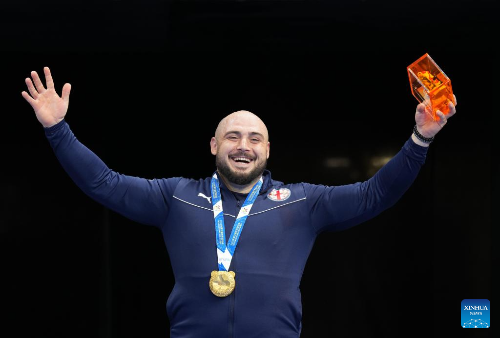 Gold medalist Temuri Samkharadze of Georgia poses during the victory ceremony for the Men's Super Heavyweight of Powerlifting event at The World Games 2025 in Chengdu, southwest China's Sichuan Province, Aug. 15, 2025. (Xinhua/Xu Suhui)
