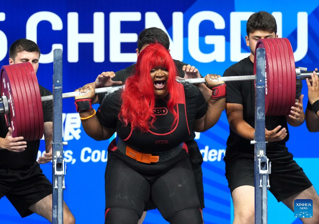 Sonita Kyen Muluh of Belgium competes during the Women's Super Heavyweight Final of Powerlifting event at The World Games 2025 in Chengdu, southwest China's Sichuan Province, Aug. 15, 2025. (Xinhua/Xu Suhui)