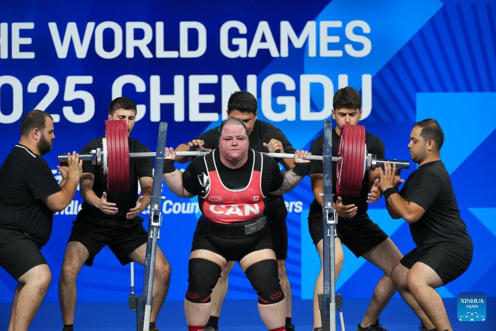 Brittany Dayle Schlater of Canada competes during the Women's Super Heavyweight Final of Powerlifting event at The World Games 2025 in Chengdu, southwest China's Sichuan Province, Aug. 15, 2025. (Xinhua/Xu Suhui)